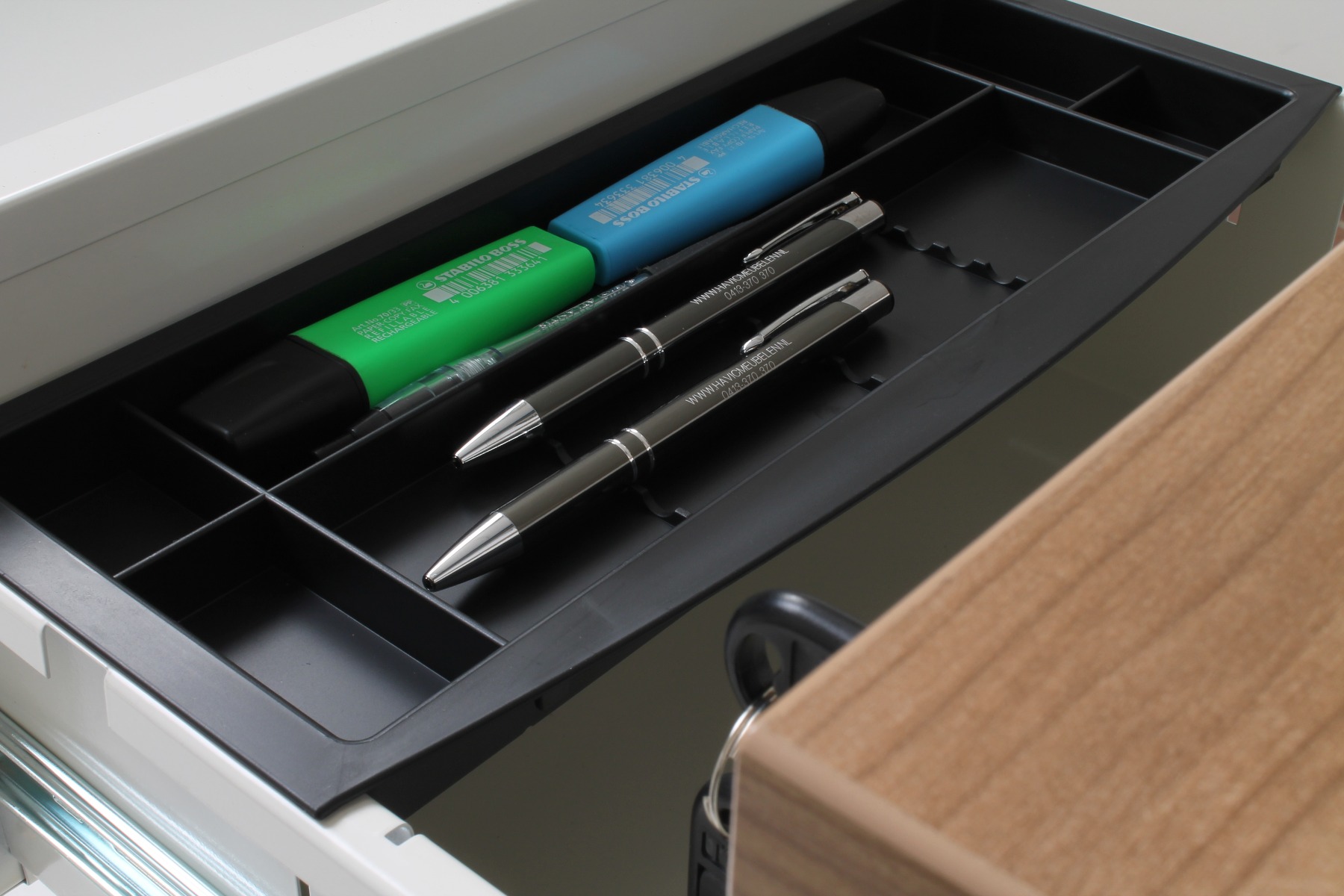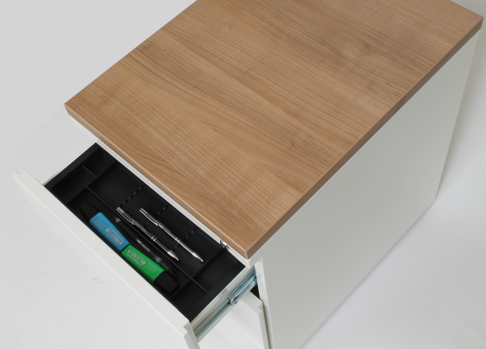 - 3 lades, incl. een pennenbakje in de bovenste lade - Optioneel: Topblad 25 mm in decor naar keuze in formaat 39,2 x 54,5 cm (BxD)