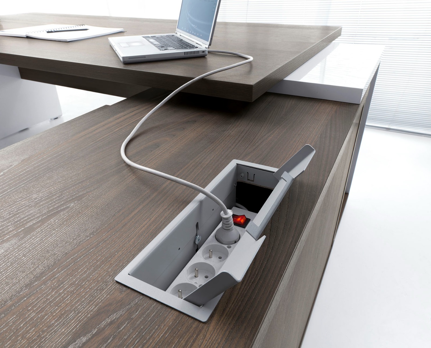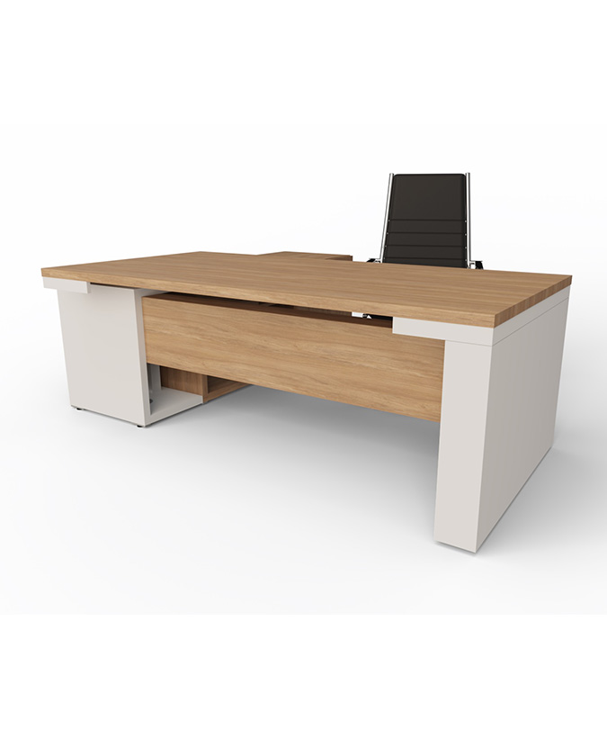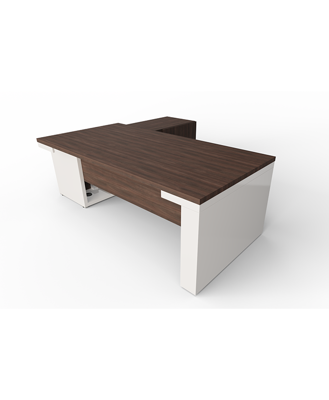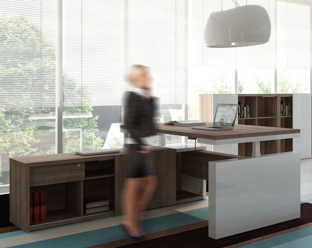 Het elektrisch verstelbare directiebureau is leverbaar in 2 verschillende houtdecors in combinatie met hoogglans witte of hoogglans zwarte elementen.