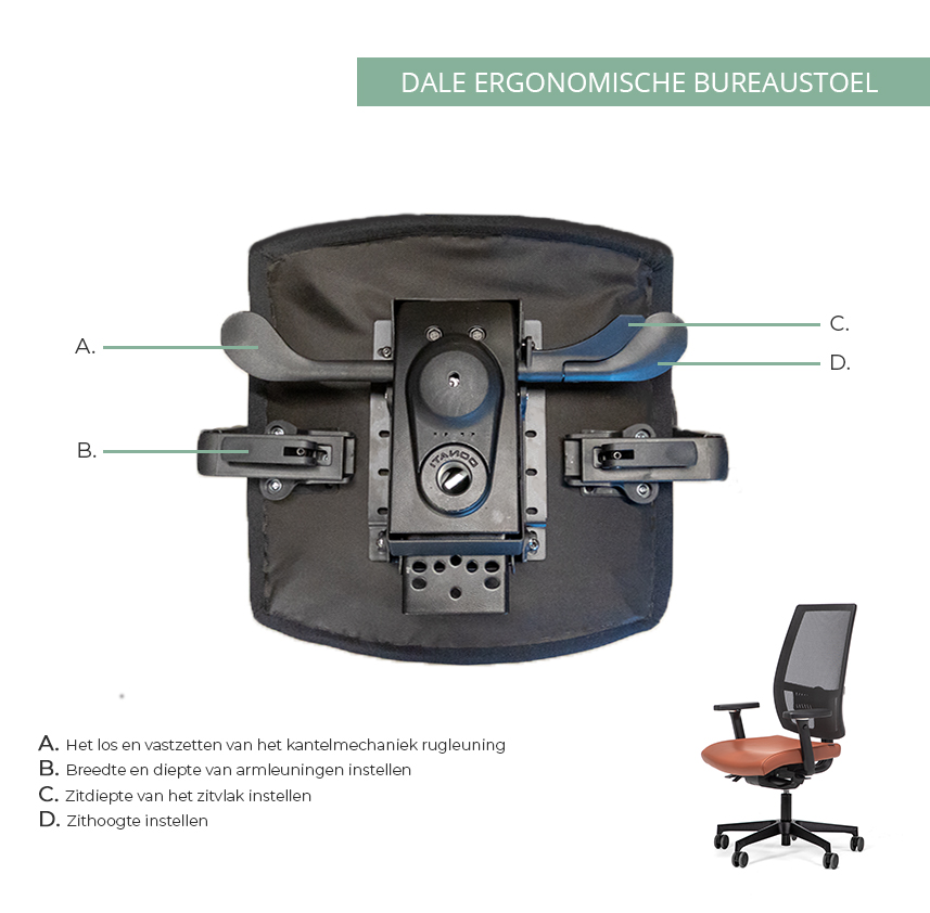 De ergonomische bureaustoel Dale heeft veel verschillende ergonomische functies. De stoel is standaard uitgerust met een zwart onderstel en de rugleuning is uitgevoerd in zwart mesh. Daarnaast heeft de Dale bureaustoel: